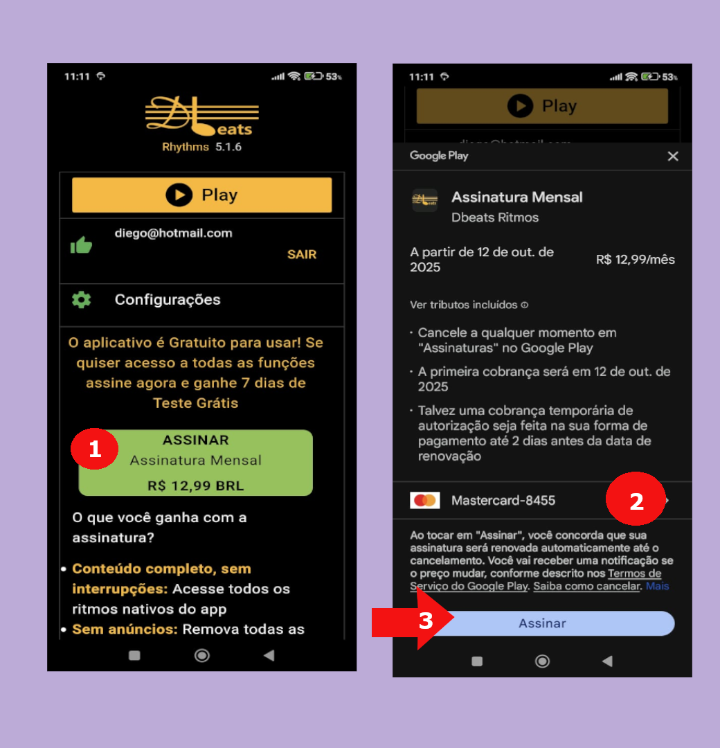Para assinar o Dbeats Ritmos, você precisa cadastrar um método de pagamento válido associado a sua conta da Play Store que geralmente é o email (gmail) que você usa no celular.Veja como cadastrar por exemplo um cartão de crédito na Play Store: